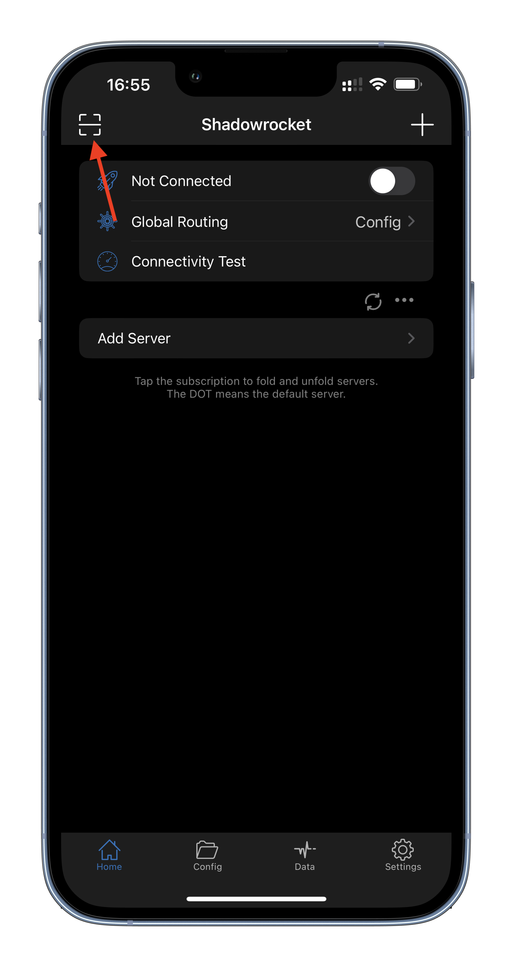 Теперь откройте приложение Shadowrocket на телефоне. В верхнем левом углу нажмите на иконку сканера QR-кода, и отсканируйте код от ключа старого формата в личном кабинете.