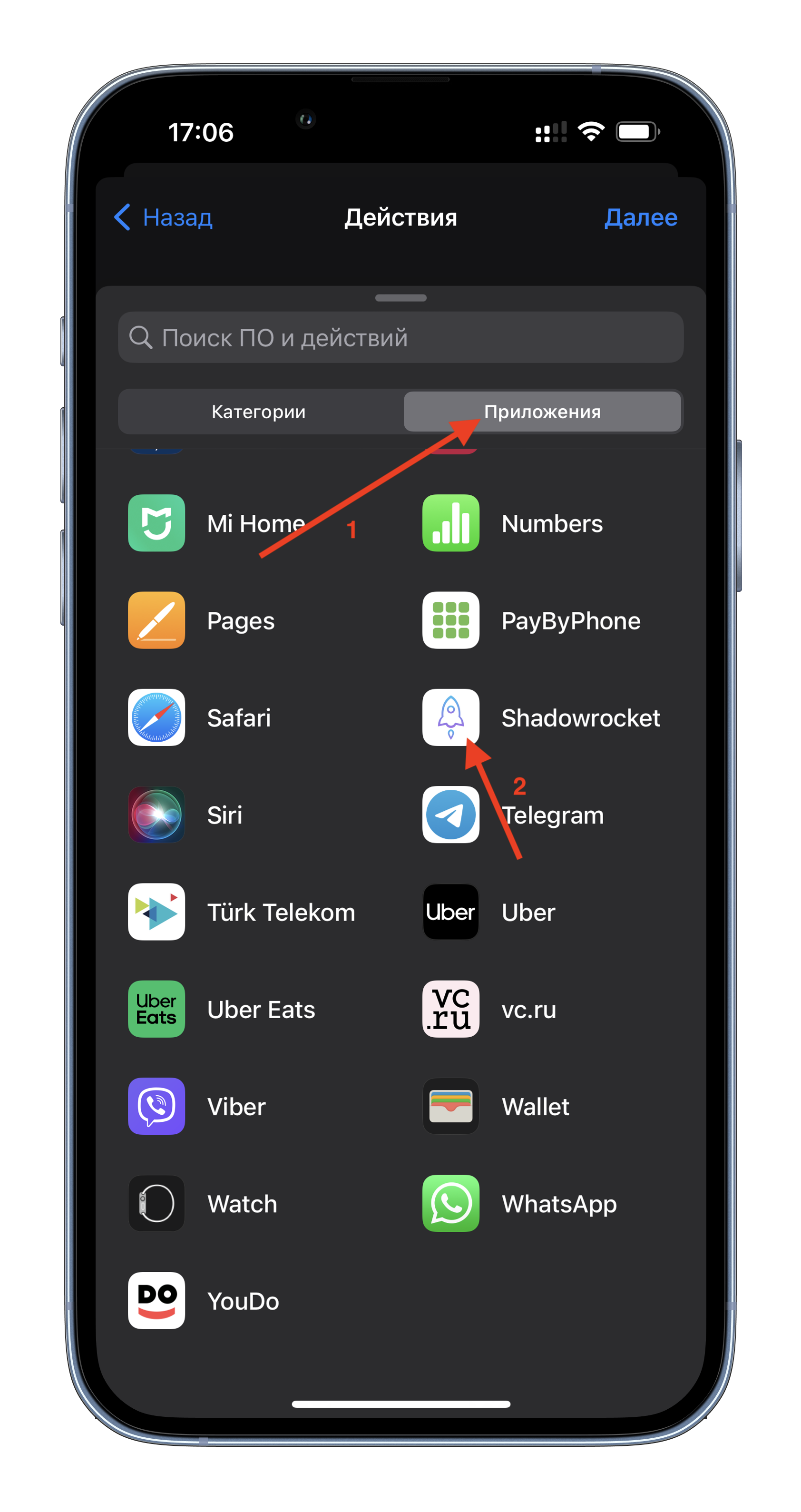 Теперь нужно выбрать, какое действие будет выполняться при запуске выбранных приложений. Зайдём во вкладку «Приложения» и выберем там «Shadowrocket». Затем выберем «Start Shadowrocket»